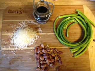I had gotten garlic scape from Beechwood Orchards at the Univ. of Pennsylvania farmers market. Garlic scape is the shoot from the garlic that produces the flower and seeds.