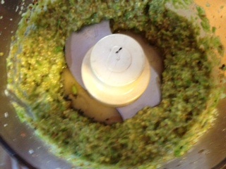 Put the garlic scape, pistachios and cheese in the food processor and pulse until medium-finely chopped.