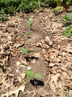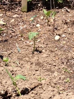 The 2 half-rows of bush beans I planted 2 weeks ago have survived the birds so far, so today was thinning day. I am hopeful that I may have some beans later in the summer. I planted a few different types interspersed, so I will not know which they are til they start bearing their pods.