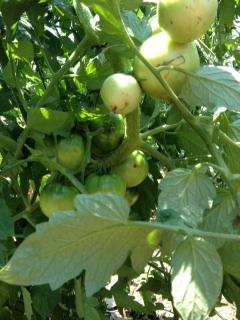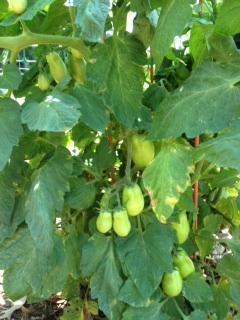 My main work was with my tomatoes. When I went out this morning, the branches of every tomato plant were so heavily laden with tomatoes that many had broken or bent and were now resting on the ground. I removed some of the broken branches and am ripening those tomatoes in a paper bag. The rest I tied to the plant supports with garden twine. THe plum tomato plant is especially vibrant, lots of sauce will be made!