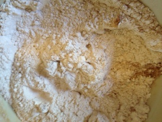 Combine flour, cinnamon, baking soda, baking powder, salt, nuts and raisins (in other words, the rest of the ingredients).