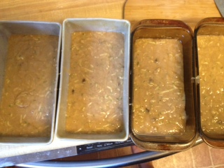 Every year, seemingly endless loaves of zucchini bread fill our freezer. There was already one there from Arielle’s baking last weekend. When I went to the garden and found some zucchini I had apparently missed a few days ago, I realized my zucchini bread baking was about to begin. And it was going to be a double batch – made with just 2/3 of the zucchini below. The rest will go into dinner tonight.