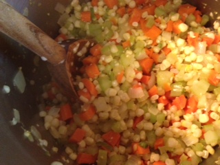In a large pot, heat the oil over medium high heat. Add te onions, garlic, celery, carrots and peppers. Cook, stirring, until soft, about 5 minutes. Add the corn and cook, stirring until the corn starts to brown around the edges, 6 to 10 minutes.