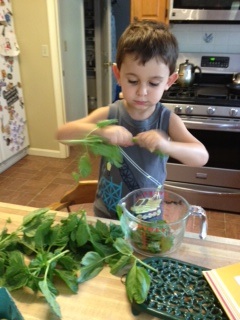 So, first things first, we went out to the garden and picked some basil. His task was the pick the leaves off the stems.