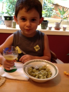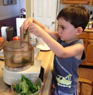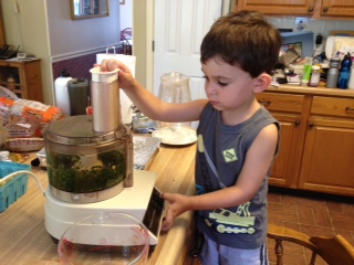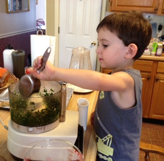 The only problem with his being called the “Top Chef” is that he has decided that I am to be called the “Bottom Chef”. I have tried to convince him to at least call me his sous chef, but noooo, “Bottom Chef” it is. And he loves to use it. At each step of the pesto, I heard “Bottom Chef, what comes next?” We used the pictorial directions from Mollie Katzen’s Pretend Soup, so he then typically followed up by telling me what was next.