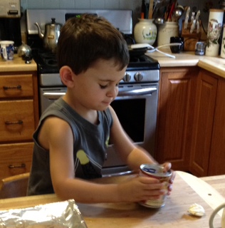 By now, you should be aware of how much we like pesto. So, to make sure he always can have pesto to eat, it was time for our “Top Chef” Cammy to make his own. His was just like mine, minus the pine nuts. For the recipe, see my Pesto post.