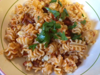 Pasta with Corn, Turkey Bacon and Tomato Confit