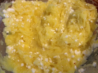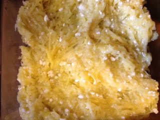 Cut the squash in half lengthwise. Scoop out the seeds with a spoon. Scrape the flesh of the squash with a fork to remove all the spaghetti-like strands. wrap with paper towels and squeeze out excess liquid.