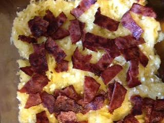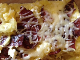 I harvested about 8, varying in size from perfect single person serving to large enough to feed the family. So I will be trying a few different uses of spaghetti squash. This recipe is one I have done a few times, and I think I have finally figured out all the adjustments to make it just right. After years of trying different brands, I have finally found a turkey bacon we all like – Godshalls. They even make a maple turkey bacon that would also be very good in this recipe.