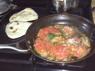 Also while the eggplants cook, make or heat up the flat bread. Below is the naan heating over our griddle plate.