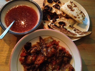 Fried eggplant khoresh is similar to eggplant khoresh, but rather than being a stew, it is more like a thick dip, best eaten with a good flat bread – we used naan. Also, instead of pickled vegetables, this gets its tang from an accompaniment of grated onions in wine vinegar. It makes for a very communal and very tasty dinner.