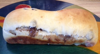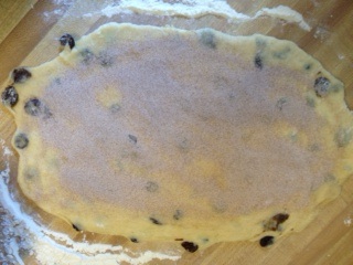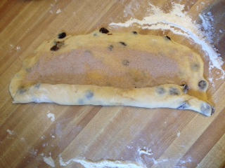 For the cinnamon raisin loaf, roll the dough into a rectangle. Sprinkle it with cinnamon sugar (a mis on 1 Tbsp cinnamon with 1/2 cup sugar).