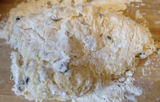Add 2 more cups of flour, beating well with a wooden spoon until the dough leaves the sides of the bowl. Place the last 2 cups of flour on your work surface. Knead the dough until almost all the flour is absorbed into it.