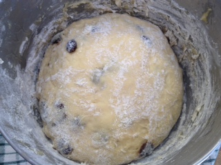 Beat 3 eggs with the honey. Add the remaining 1/2 cup warm water, oil and salt. Add the yeast mixture, beating well with a spoon. Add 5 cups of the flour, one cup at a time, beating well with a wooden spoon after each addition. The dough will be sticky. Add the raisins.