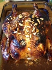 I rarely make roast chicken, but when I do, I cannot bring myself to make any other chicken than this. It has become my go-to dish for Rosh Hashanah and often finds its way to the Passover Seder (when I am not doing a Persian meal). The bird is always moist, the skin sweet and crispy, and it always gets raves. One of its secrets – an orange placed in the cavity. But it is also the combination of orange, ginger, honey, soy sauce, garlic and almonds, a perfect combination.