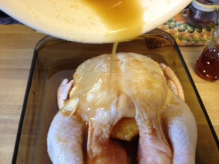 Preheat oven to 400F. Place the chicken in a roasting pan with 1 cup of water. Put the peel from the orange and place it in the bird’s cavity.