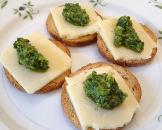 One of the things we picked up at the farmers market in San Diego was a parsley-chili pesto from Hani’s Market (a local San Diego company).  This was a wonderful thing, I found myself finding excuses to eat it all day long.  I would put it on pita bread points, on crackers with cheese, on salads with feta, you name it, I (and Heather and Ken) put it on it!