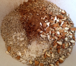 In a large bowl, combine the oats, coconut, sesame seeds, sunflower seeds, cinnamon, almonds, oat bran and wheat germ (if you are using it).