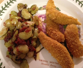 I made them as a side dish to my cornflake crumb chicken tenders (look for the recipe for that in a few days). So it was kind of a retro-themed dinner – my modern version of a 1950’s lima bean and chicken cutlet dinner.