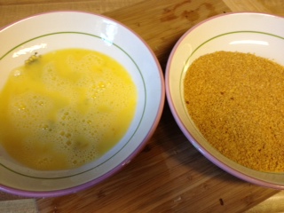 Preheat the oven to 375F. Combine the cornflake crumbs, salt, pepper and cayenne in a shallow dish. In another shallow dish, beat the egg with the water.