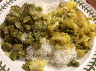 Ode to Okra #3 is an Indian preparation – so simple and oh, so good. But we don’t eat that alone, there is typically another dish with it; one of my favorites is cauliflower and peas. Normally the okra would be from my garden, but given the poor harvest, I did not have enough to use my own this time. So these dishes were made with locally grown okra and cauliflower, and peas from Farmer Kim that I had frozen earlier in the spring.