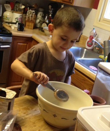 I have mentioned before how much I like JoyofBaking.com. So when it came time to find something fun to make with Cam for Halloween, that is where I turned. I needed something he could do the decorating himself, and I found their chocolate spiders – chocolate macaroons with chocolate-covered pretzels for legs. Perfect! He could roll pretzels in chocolate, stick them into the macaroons and even add the eyes.