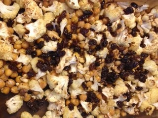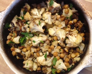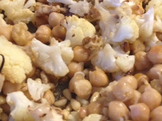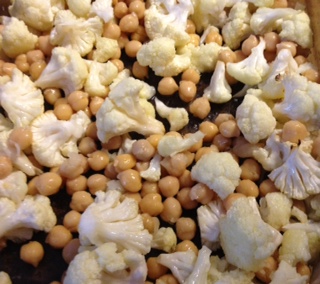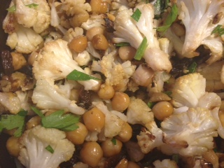 I was having a friend over for lunch whom I had never cooked for before, so I wanted to make something interesting but light. We were going kayaking after lunch, so I didn’t want anything heavy that would sit in our stomachs. I had cauliflower in the fridge, so I made a version of the roasted cauliflower and chickpea salad I found on emmycooks.com.
