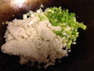 Wipe out the wok and add 1 Tbsp oil, heat over medium-high heat. Add the ramen noodles and the scallions. Stir and cook til heated, about 1 – 2 minutes.