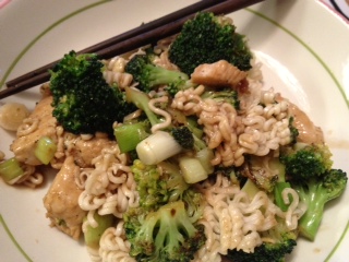 Ramen, as a convenience food, feels like it should be a dish made with whatever is in the house. For us, this week, it is chicken breast, broccoli and scallions. But other veggies would work well, too – carrots, peas, string beans, etc. You could make this vegetarian or even use beef, if that is your preference.