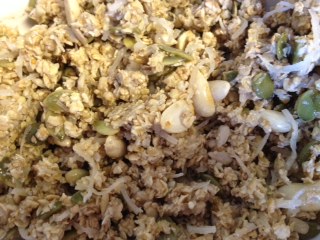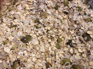 In a large bowl, mix together the oats, coconut, sesame seeds, pumpkin seeds, sunflower seeds, cinnamon, peanuts, and oat bran.