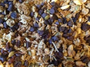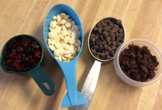 These sound decadent, and they are, but they are also healthy, with lots of fiber, vitamins and minerals in them. I couldn’t decide what granola to make, so I raided the pantry and came up with these combos. What goes better with macadamia nuts than white chocolate? And dried cranberries and white chocolate are another great combo, so I put all three together. For the other half of the batch it was GORP – good old raisins and peanuts – but with some dark chocolate thrown in, just ’cause I like it.