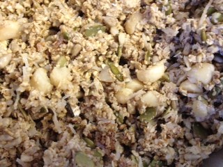 In a large bowl, mix together the oats, coconut, sesame seeds, pumpkin seeds, sunflower seeds, cinnamon, macadamia nuts, and oat bran.