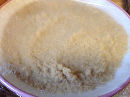 Invert a large plate on top of the pan and quickly invert the pan and plate together, releasing the couscous onto the plate.