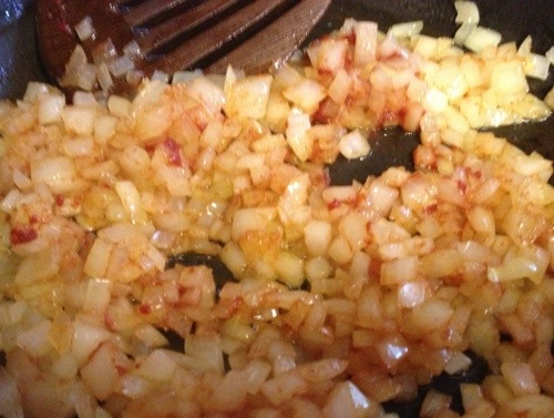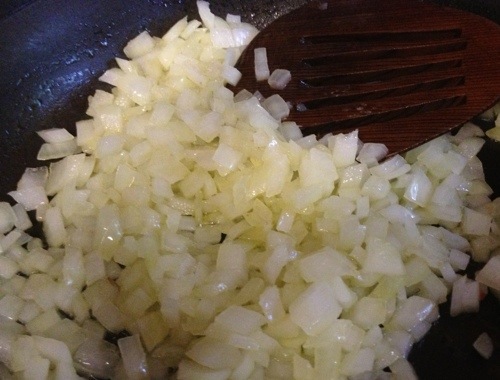Pour 2 Tbsp of the olive oil into a nonstick pan about 8 1/2 inches in diameter and place over medium heat. Add the onion and cook for 5 minutes, stirring often, until the onion is softened but not colored.