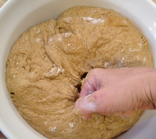 Add the rest of the flour, one cup at a tim. Knead. Place in an oiled bowl, cover and let rise 1 hour, til it double in bulk. Heat the oven to 375F.