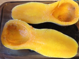 Preheat the oven to 350F. Cut the squash in half lengthwise, scoop out the seeds. Put it is a roasting pan cut-side down. Add about 1/2 inch of water. Cook for 1 hour, until a knife stuck into the shell goes in easily.
