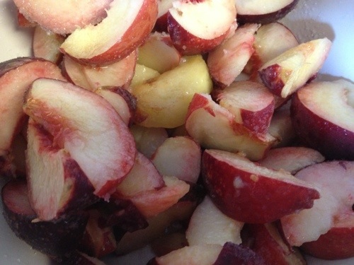 Wash and rub the peaches to remove any fuzz. Cut the peach following the suture from stem to blossom end and then up the opposite side. Gently twist the two halves of the peach and it should easily separate. Remove the seed and cut into 3/4 – 1 inch (2.5 cm) slices. You will need about 4 cups (1 pound) (454 grams) of sliced peaches.