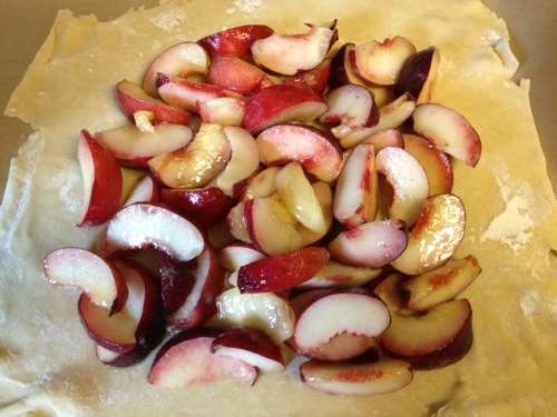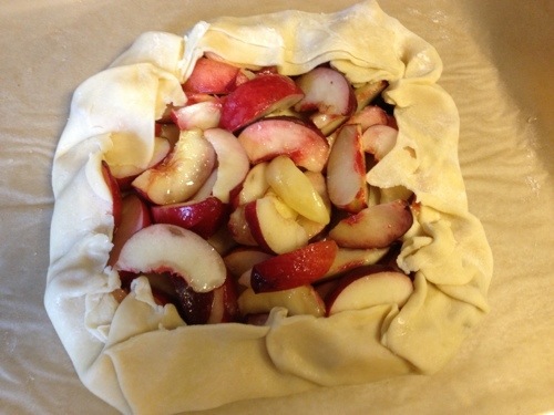 Gently fold the edges of the pastry up and over the peaches, pleating as necessary. Make sure to seal any cracks in the pastry.