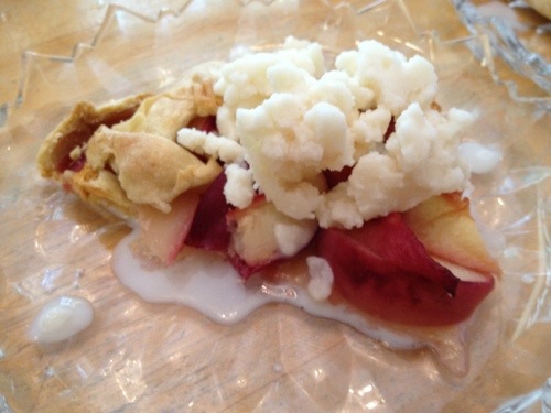 Warm tart and ice cream go particularly well, but we did not have ice cream. So, while the tart was baking, Arielle made some ziploc bag vanilla ice cream. It may not have been much to look at, but the flavor was spot on! The tart was nice and warm, it immediately started melting the ice cream. What a great treat!