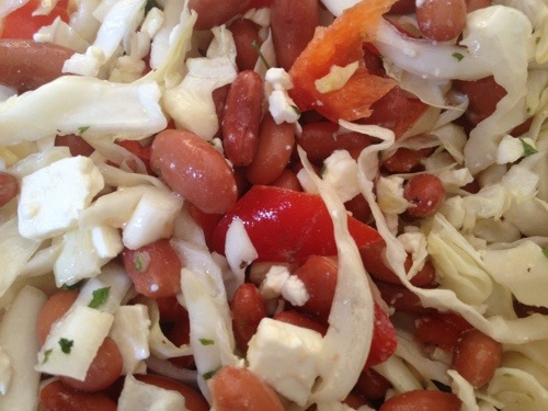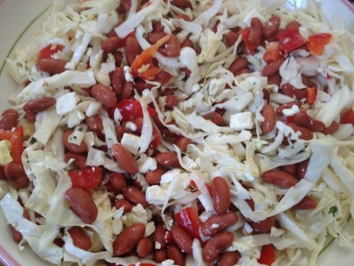 Mix together the cabbage, kidney beans, red pepper in a large bowl.