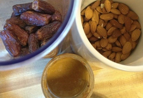I decided to try to make an energy bar of my own with simple ingredients: almonds, almond butter, dates.