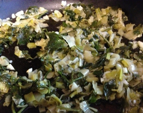 Heat the oil over medium-high heat in a large non-stick skillet. Add the Qormeh Sabzi vegetables and garlic. Cook for about 1 minute.