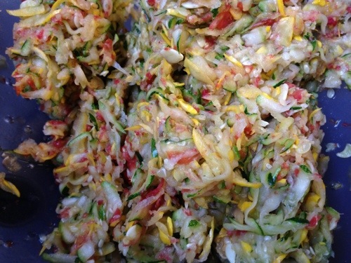 Grate the squash and tomatoes. Toss with 1 tablespoon salt, then let drain in a colander in the sink, 30 to 40 minutes. Squeeze the squash to remove as much liquid as possible.