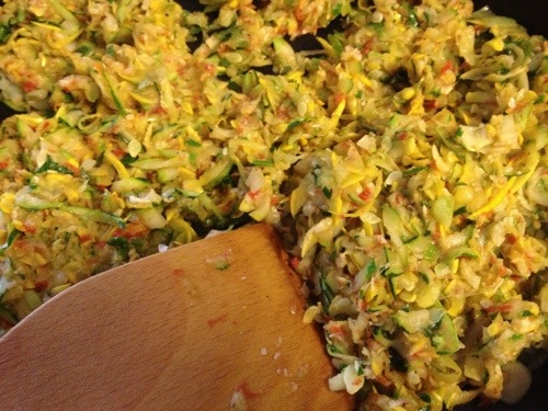 Heat the olive oil in a large oven-proof skillet over medium-high heat. Set aside 3 tablespoons scallion greens. Add the remaining scallions (white and green parts), the jalapeno, and salt to taste and cook until the scallions are soft, about 3 minutes. Add the shredded squash and cook, stirring occasionally, until tender, about 7 minutes. Stir in the parsley and pepper to taste. Cook until the mixture is slightly dry, about 1 more minute. Remove from the heat and let cool, 5 minutes.