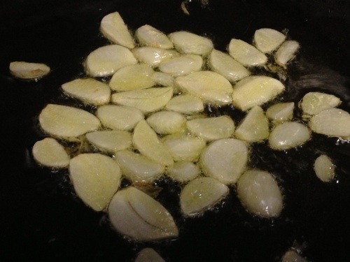 As soon as the pasta is cooking, pour the remaining olive oil into the big skillet, set it over medium- high heat, and scatter in the sliced garlic. Cook for a minute or two, until it is sizzling and lightly colored.