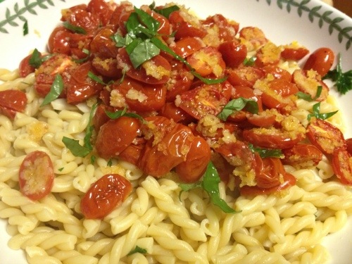 When the pasta is al dente, lift it from the water, drain for a moment, and drop it into a large pasta bowl. Toss pasta quickly with the garlic-and- parsley sauce and 1/2 cup pasta cooking water, then slide the baked tomatoes on top of the pasta.