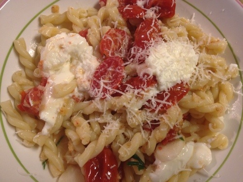 Scatter the basil shreds all over, and toss everything together well, until the pasta is evenly dressed and the tomatoes are distributed throughout. Add the grated cheese and toss again. Shred the ricotta all over the top of the pasta. Serve immediately and enjoy!