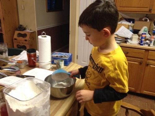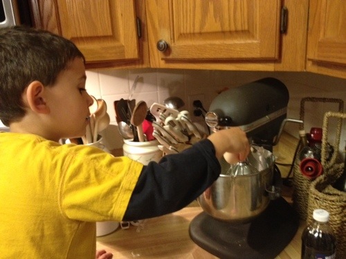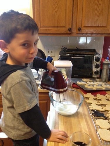 My self-proclaimed “Top Chef” is back; Cammy has returned to the kitchen! His first project…Halloween cookies he saw in a book. He then made his father buy the book for him, so his personal cookbook collection is now up to 3. He also likes to get story books that include a recipe related to the story. I love it!
