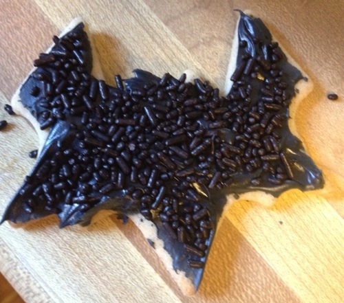 For the bats, the icing is coated with black sprinkles. Gently press the sprinkles into the icing.