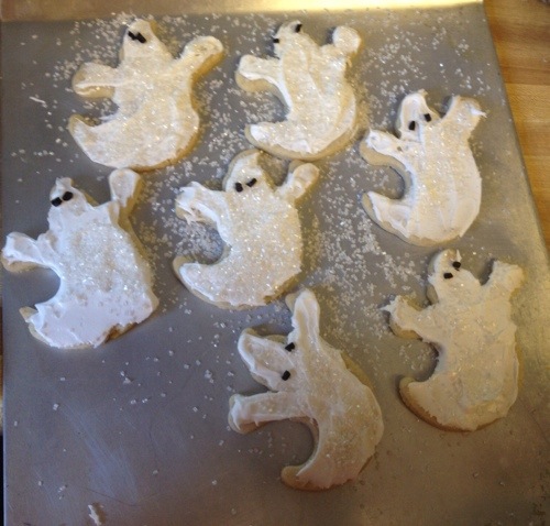For the cookies we made, we started with the ghosts, using white icing, and sprinkling with white decorating sugar. Cut small pieces of licorice for the eyes.